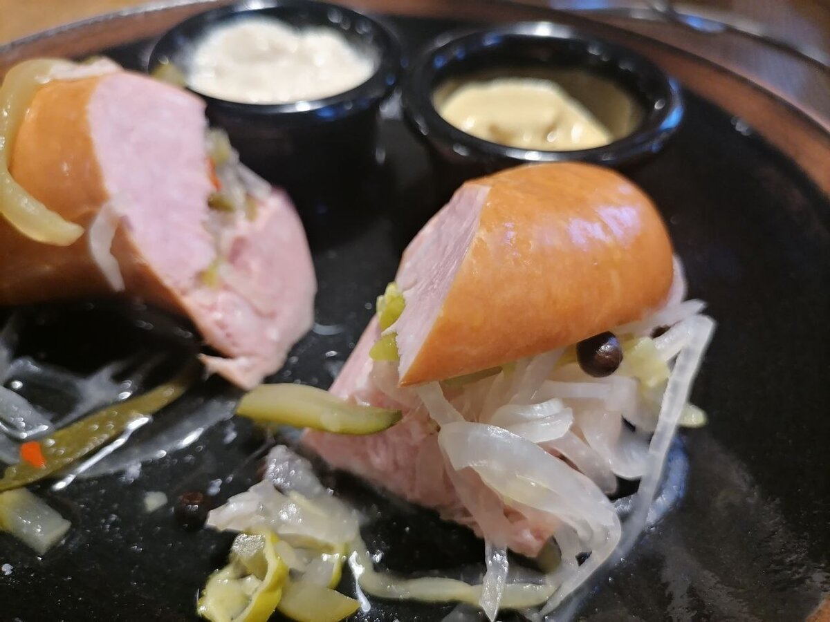 В ее основе колбаски - шпикачки, маринованные огурцы и лук.