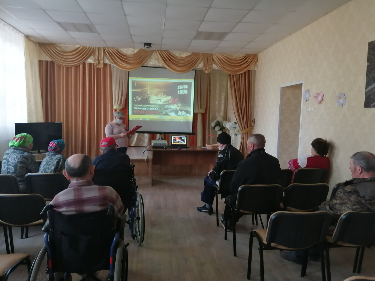В Мензелинском доме-интернате для престарелых и инвалидов прошла беседа «Слезы Чернобыля» об одной из самых страшных техногенных катастроф XX века – аварии на Чернобыльской АЭС. В этой беседе воспитатель рассказала о трагедии на Чернобыльской АЭС, объяснила в доступной форме для пожилых людей, почему это произошло. Цель: вспомнить об аварии на Чернобыльской АЭС, ставшую страшной трагедией для человечества и унесшую огромное количество жизней, нанесшую огромный урон экологии страны и мира; донести до пожилых людей опасность взрывов на атомных АЭС, показать героизм русских людей при ликвидации аварии на АЭС. Задачи беседы: Показать последствия аварии. Способствовать развитию активной жизненной позиции, воспитанию толерантности, духовно-нравственных чувств: чувства сострадания, бережного отношения к окружающему миру, любви к природе. В конце беседы получатели социальных услуг посмотрели документальный фильм «Возможно, ты не знал этого».