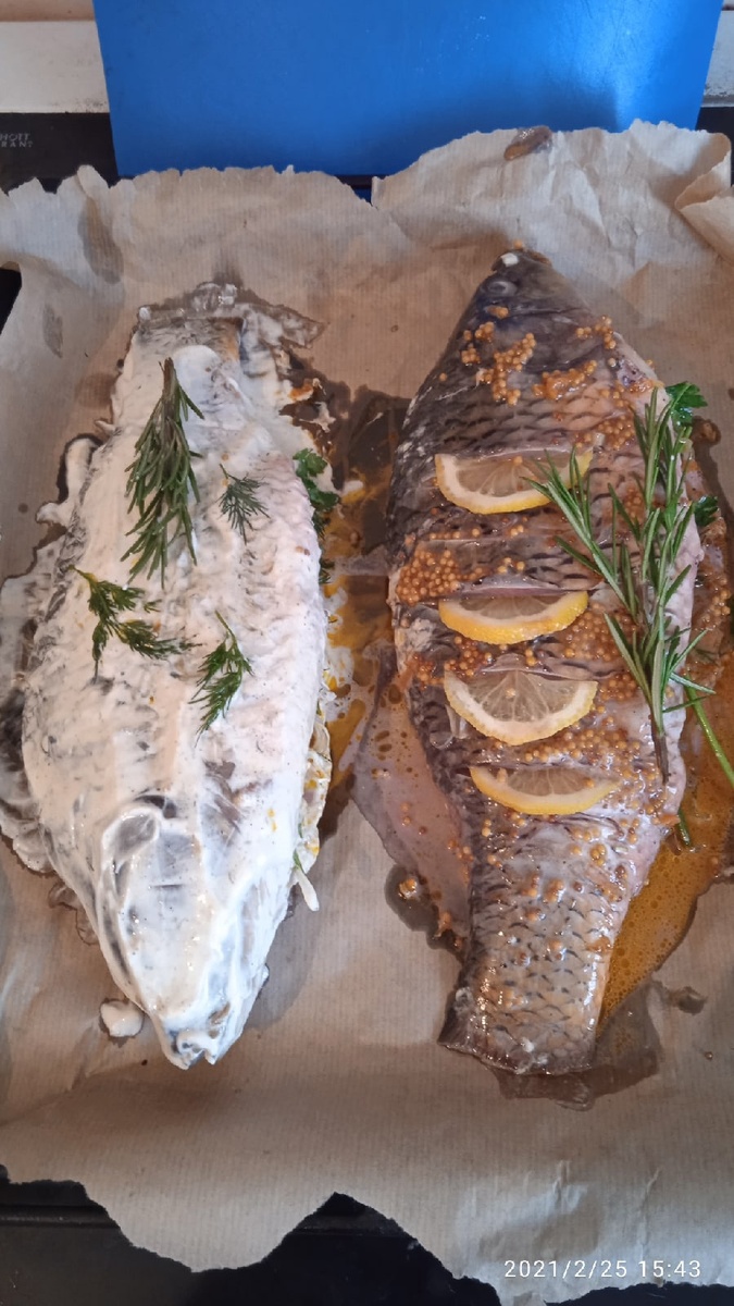 ИНГРЕДИЕНТЫ: 1 СОУС СМЕТАНА — 3 ст. л ЧЕСНОК — 2-3 зубчика СОЛЬ, ПЕРЕЦ СВ.МОЛОТЫЙ, ВЕТОЧКА РОЗМАРИНА. ЛУК РЕПЧАТЫЙ - 1 шт. Большая. СПОСОБ ПРИГОТОВЛЕНИЯ: Все ингредиенты смешать, лук нарезать полукольцами, рыбу намазать внутри и снаружи, также во внутрь вложить резаный лук и веточку розмарина. 2 СОУС ФРАНЦУЗСКАЯ ГОРЧИЦА - 2 ст. л ЛИМОН - 1.5 шт. СОЕВЫЙ СОУС - 4 ст. л СОЛЬ, ПЕРЕЦ СВ.МОЛОТЫЙ . СПОСОБ ПРИГОТОВЛЕНИЯ: ВСЁ ТАКЖЕ, ВСЕ ИНГРЕДИЕНТЫ СОЕДИНИТЬ, ПЕРЕМЕШАТЬ, НАМАЗАТЬ СНАРУЖИ И ВНУТРИ. ВСЯ ЭТА КРАСОТА МАРИНУЕТСЯ 30 МИН. ЗАТЕМ В РАЗОГРЕТУЮ ДУХОВКУ НА 40 МИН. ПРИ ТЕМПЕРАТУРЕ 160-170° ПРИЯТНОГО АППЕТИТА!!! ГОТОВЬТЕ ВМЕСТЕ СО МНОЙ И ВСЁ ПОЛУЧИТСЯ!!!! #рецепт #рыба #вкусно #просто и вкусно #духовка #ужин #ужин для всей семьи #кулинария