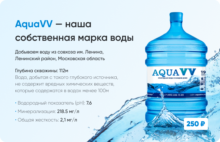 Бесплатная доставка воды aquavv на дом и в офис в Москве и области При заказе от трех бутылей объемом по 19 л Получите чистую питьевую воду для кулера максимально быстро – принимаем заказы каждый день с 09:00 до 21:00, а развозим по будням и субботам.