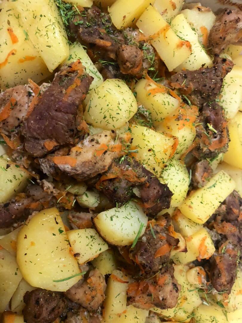 #картошка #мясо #запеченаякартошка #запеченаякартошкасмясом #картошкасмясомврукаве #обед #ужин #вкусно #быстро #второеблюдо #овощи #лук #морковь #чеснок #специи #мясоврукаве Ингредиенты: Мясо (говядина, свинина, баранина), Картофель, Лук , Морковь, Чеснок , Соль, перец черный молотый, хмели-сунели, базилик, орегано, Сливочное масло Способ приготовления: Мясо промываем и нарезаем на средние кусочки. Картофель промываем, очищаем и крупно нарежьте. Лук нарежьте дольками, морковь натираем на крупной терке или нарезаем кружочками. Картошку и мясо перекладываем в глубокую миску, добавляем лук, морковь, измельчённый чеснок, соль, перец и специи, и сливочное масло. Всё тщательно перемешиваем и перекладываем в рукав для запекания, а потом на противень. Концы рукава хорошо завязываем. Отправляем в разогретую до 180 градусов духовку на 1 час. Если хотите, чтобы мясо было с корочкой, за 10 минут до конца вскройте пакет и продолжаете запекать. В конце можно посыпать зеленью. Приятного аппетита!!!