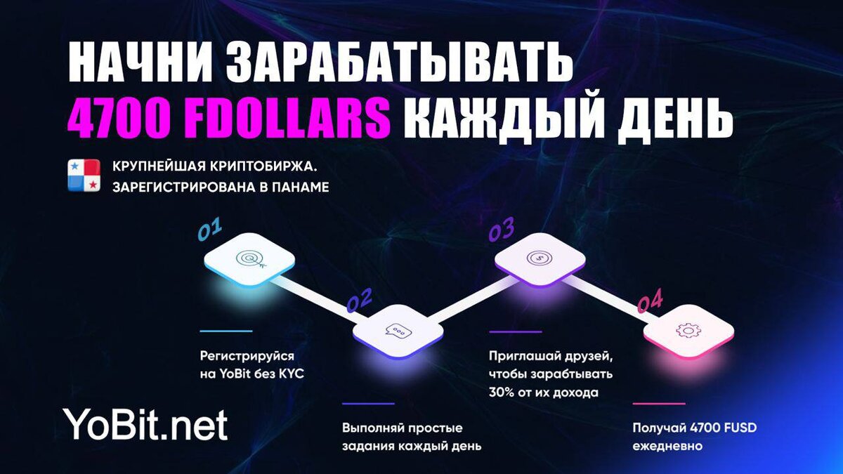 YoBit — одна из лучших бирж на криптовалютном рынке, работает с 2014 года , не требует верификации личности для проведения операций, в том числе для вывода криптовалюты! Биржа проводит глобальный AirDrop с общим пулом $50 млн и ежедневными наградами до 4700 токенов FastDollars ($FUSD) $FUSD - собственный токен биржи, продать его можно будет в июне 2022 года. 4700 $FUSD равны примерно 100 USDT. Что необходимо сделать чтобы принять участие? 1. Регистрируемся на бирже без верификации. (получите 300 FUSD) 2. Запустите Telegram бота биржи. (получите 700 FUSD) 3. Внесите депозит на биржу (минимум $10). (получите 700 FUSD) 4. Совершите хотя бы 1 сделку на бирже. (получите 900 FUSD) 5. Совершите хотя бы 1 своп на Defi платформе биржи. (получите 900 FUSD) 6. Внести активы в Defi пулы ликвидности YoFarm. (получите 1100 FUSD) Все задания простые и их можно выполнять ежедневно, чтобы получать до 4700 $FUSD каждый день! AirDrop продлится до июня 2022 года, так что у вас есть еще достаточно времен