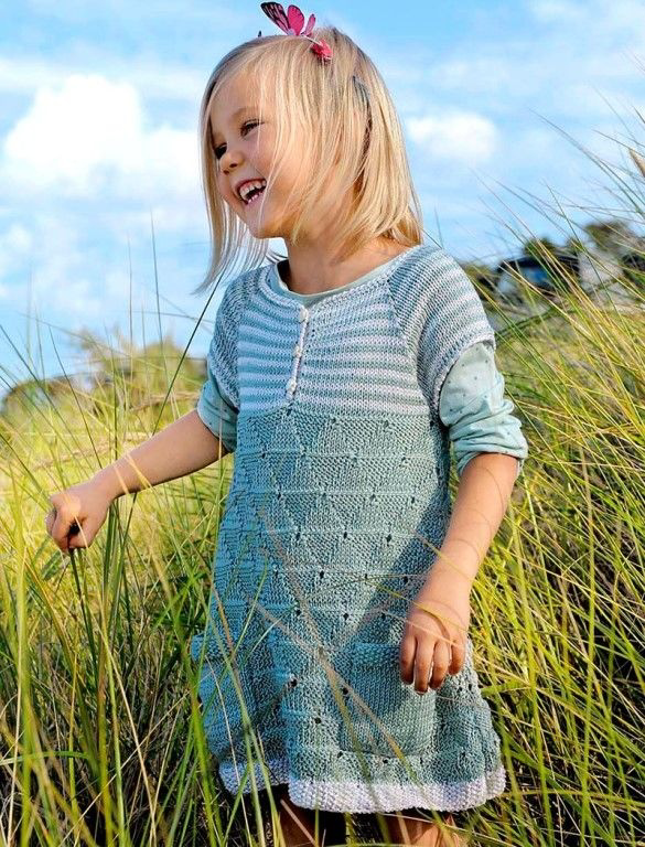 Симпатичное платье с юбкой-колокольчиком, застежкой на пуговицы и удобными карманами – идеальная форма на лето! РАЗМЕРЫ 104–110 (116–122) 128–134 ВАМ ПОТРЕБУЕТСЯ Пряжа (100% хлопка; 110 м/50 г) – 250 (300) 300 г серо-зеленой и 100 (100) 150 г светло-бежевой; спицы № 4; круговые спицы № 4; крючок № 3,5; 3 перламутровые пуговицы. УЗОРЫ И СХЕМЫ ЛИЦЕВАЯ ГЛАДЬ Лицевые ряды – лицевые петли, изнаночные ряды – изнаночные петли. В круговых рядах все петли вязать лицевыми. ИЗНАНОЧНАЯ ГЛАДЬ Лицевые ряды – изнаночные петли, изнаночные ряды – лицевые петли. ПЛАТОЧНАЯ ВЯЗКА Лицевые и изнаночные ряды вязать лицевыми. УЗОР ПЛАНКИ Попеременно 1 п. лицевой глади, 1 п. платочной вязки. РЕЛЬЕФНЫЙ УЗОР НА 10 ПЕТЛЯХ Вязать по схеме. На ней даны только лицевые ряды, в изнаночных рядах петли вязать по рисунку, накиды провязывать изнаночными. Начать с петель перед раппортом, раппорт постоянно повторять и закончить петлями после раппорта. Постоянно повторять 1–20-й ряды. ПОСЛЕДОВАТЕЛЬНОСТ