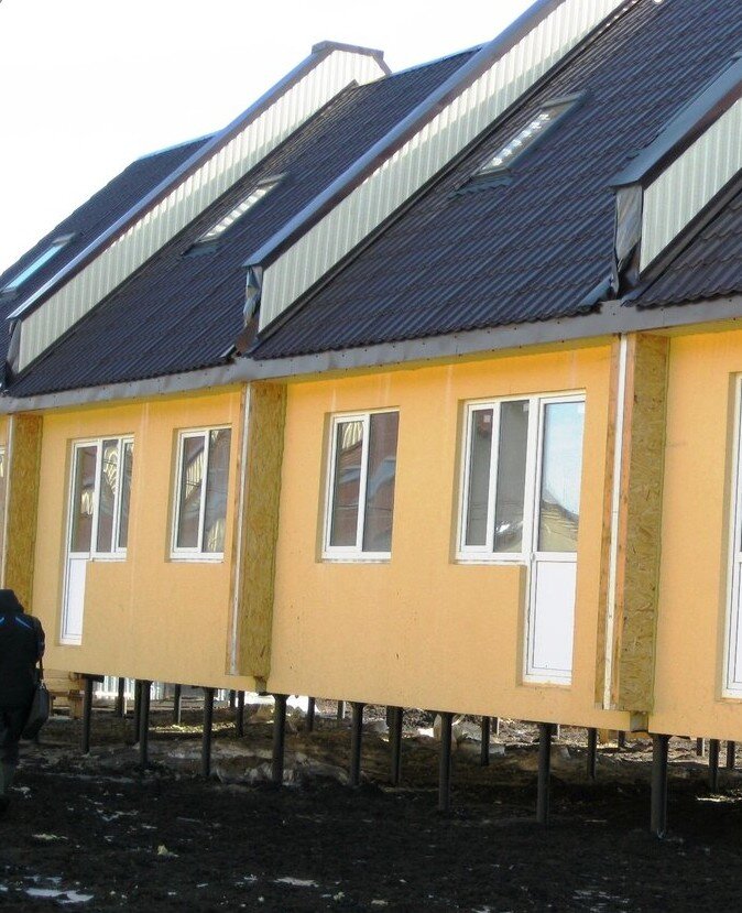 Решил показать пример из моей практики по поводу проблемы прохода влажного воздуха через низ основания пола таунхауса на винтовых сваях. Похоже меня просто не понимают, когда я пишу, что являюсь сторонником применения пароизоляции под утеплитель. Рядом с нашим участком, где ведется строительство индивидуальных домов компания – застройщик занимается монтажом каркасно – щитовых таунхаусов с применением фундамента из винтовых свай. Конечно, застройщики не любят, когда к ним заглядывают другие строители поэтому, пришлось буквально на бегу сделать несколько фотографий. Сразу хочу отметить, что расстояние от поверхности земли до нижней части основания пола на мой взгляд несколько больше, чем стоило бы её делать. Конечно, тут есть свои плюсы так как чем выше пол от промерзшего грунта, тем меньше он подвергается воздействию холода. К тому же в таком варианте можно сделать небольшое подполье, например. Пусть даже выполняющее больше техническую роль. Я заглянул под таунхаус и увидел такую карти