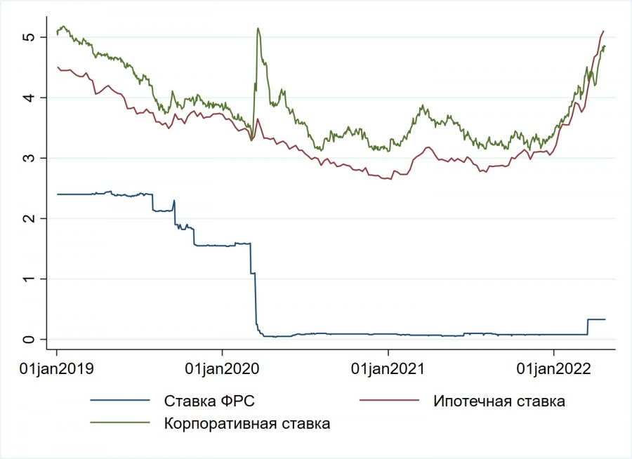 Напр., сейчас ФРС только начинает повышать ставку, а коммерческие ставки уже на уровне локальных допандемийных максимумов и выше.