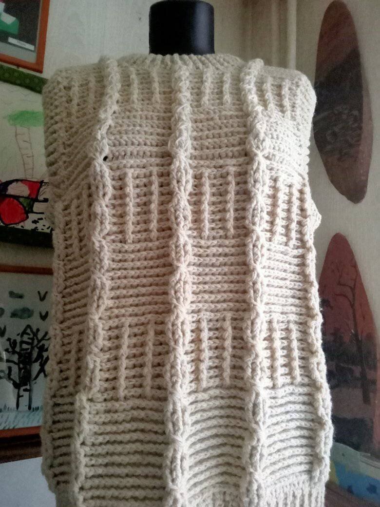 Не стала бы показывать, если бы это была не выстраданная работа. Так в жилете ничего особенного. Связан весь крючком. Во-первых, не поверите, но пряжу заказчица купила в год Олимпиады в Москве. То бишь, в 1980 году. Как ее за 43 года не нашла моль, не знаю. Чистая шерсть. Спрядена неравномерно, с колючими вкраплениями. Была изначально в пасмах, заказчица ее сама постирала, высушила и смотала в клубки. Привезла. Хрупкая седая-преседая бабулечка. Просит сыну жилетик, мерзнет, в квартире холодно, а он на удаленке работает. — Подарю! Я хотела отказаться. Слишком рисковая пряжа. Да и жилет из колючей шерсти вряд ли мужчине придется по нраву. Но глаза бабулечки... Попросила докупить тонкую мягкую нитку в цвет, хоть чуть-чуть тонизировать колючесть. Оторвала кусочек пряжи, дала бабулечке и проинструктировала как покупать в магазине, непременно у консультанта. Все удалось. Вязала с трудом, не нравится. Заставляла себя. Ну, вы понимаете, что такое творить наперекор себе. Во-вторых, загремела н