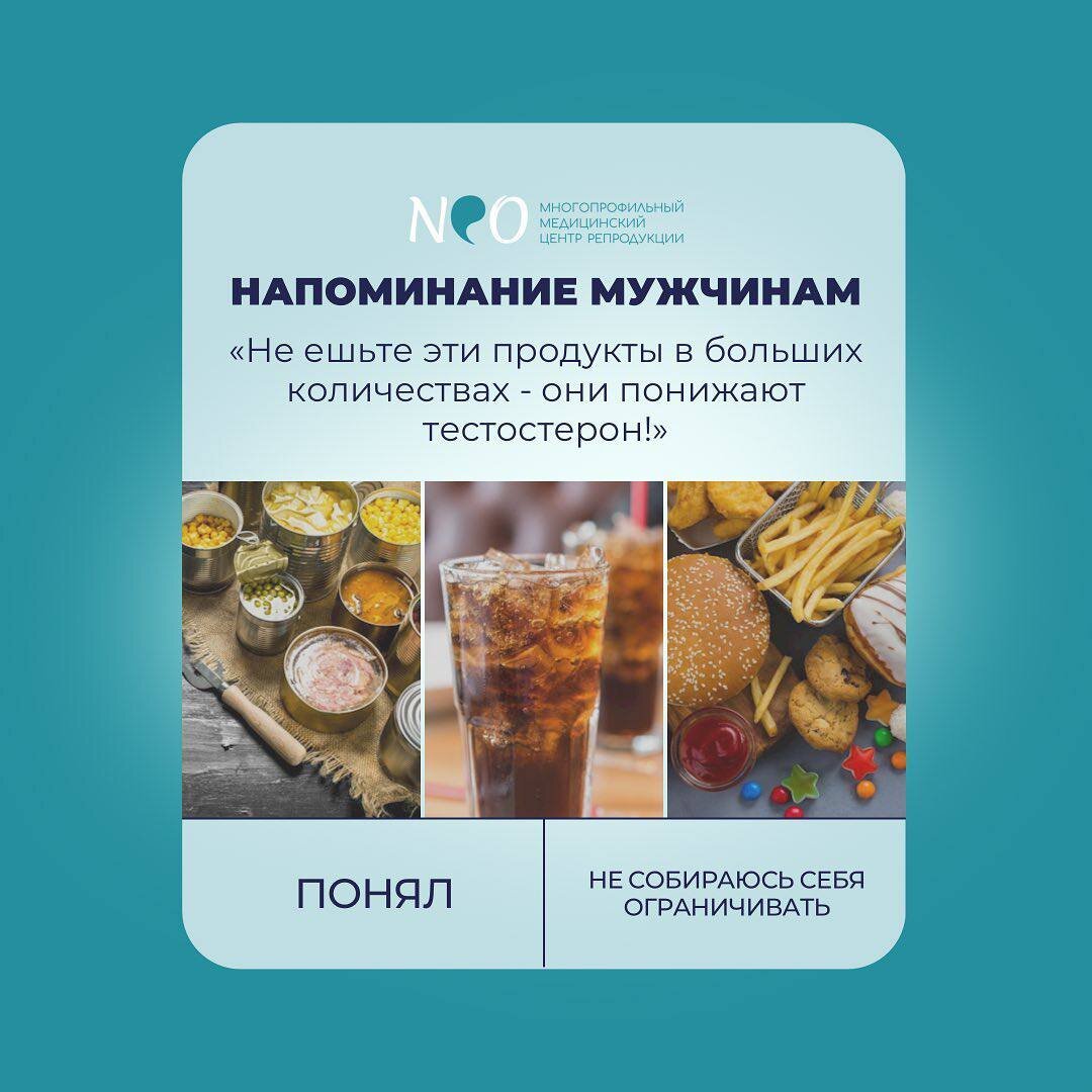 🧬 Тестостерон – мужской стероидный половой гормон. Именно он отвечает за формирование типичного мужского облика и всего, что его олицетворяет: характерное телосложение, тембр голоса, наличие волосяного покрова на лице и теле, формирование половых органов.⠀ Но нас интересует его влияние именно на половую сферу жизни мужчины.⠀ Тестостерон стимулирует сексуальную активность и помогает выработке сперматозоидов. Понижение уровня данного гормона ведет к уменьшению мышечной массы и увеличению количества жира в организме, повышая риск возникновения сердечно-сосудистых заболеваний, диабета и инсульта.⠀ Одна из основных проблем мужчин – неправильное питание! Поэтому сохраняем себе пост и не даем своим мужчинам есть в больших количествах:⠀⠀⠀ 1️⃣ Соль – состоит из хлора и натрия. Избыток натрия в организме чреват снижением выработки тестостерона.⠀⠀⠀ 2️⃣ Пиво - это сплошные фитоэстрогены, аналогичные женским половым гормонам- вот почему растут эти огромные пивные животы! Но помимо са