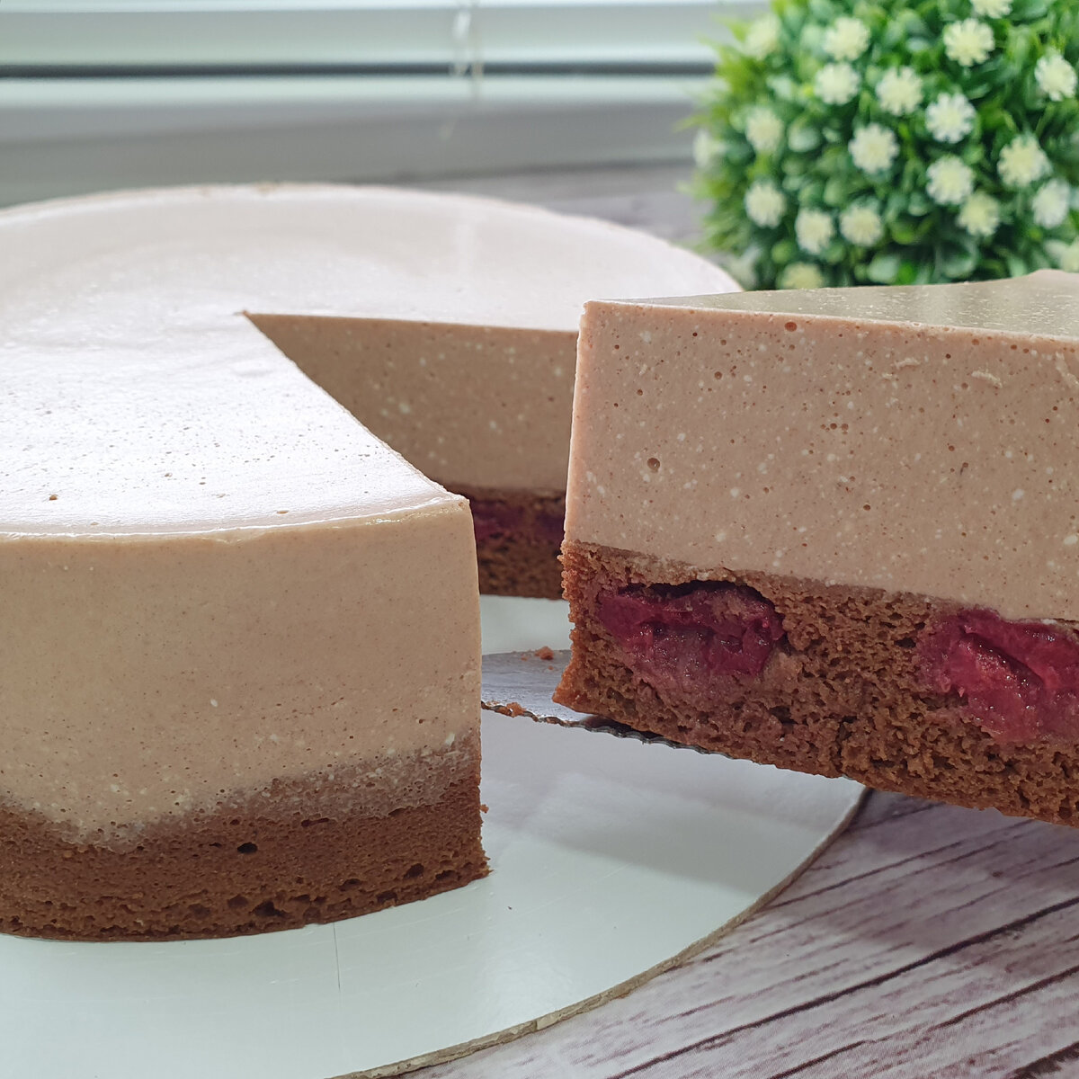 Всем привет👋 Сегодня хочу поделиться с Вами рецептом диетического ПП торта, который прост в приготовлении и не требует выпекания в духовке. В 100 гр торта содержится всего 120 ккал и очень мало углеводов👌 Тортик очень вкусный и лёгкий, после съеденного кусочка нет ощущения тяжести😊 ШОКОЛАДНЫЙ БИСКВИТ: ШОКОЛАДНЫЙ МУСС: Диаметр торта: 16 см Вес торта: 800 гр КБЖУ на 100 гр: 119,51/7,07/5,99/8,59 ПРОЦЕСС ПРИГОТОВЛЕНИЯ: Приготовим бисквит. В миске взбить венчиком яйцо, кефир и подсластитель. Добавить просеянную муку с какао и разрыхлителем. Перемешать. Перелить тесто в силиконовую форму диаметром 16 см. Сверху по кругу выложить вишню. Предварительно её нужно разморозить и сок слить. Ягоды можно не добавлять, но с ним вкус более интересный. Выпекать в микроволновке при мощности 800 Вт 5 - 6 минут. Или в духовке при 180 гр 25 - 30 минут. Готовому бисквиту дать остыть до комнатной температуры. Приготовим мусс. Желатин залить водой. Приготовить согласно инструкции на упаковке. Я испо