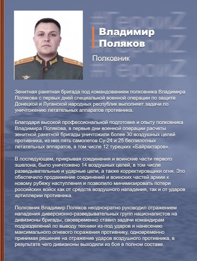И в ОСВ на Украине они зарекомендовали себя только с лучшей стороны! Хочу рассказать о зенитно ракетной бригаде под командованием полковника Владимира Полякова. Что бы твои подчиненные были такими умелыми, смелыми, и мужественными, отец-командир должен приложит огромное количество сил, душевного тепла и внимания к своим подчиненным. И в бою ты будешь знать - твоя гвардия тебя не подведет, и вместе можно сделать невозможное, Вот и бригада под командованием полковника Владимира Полякова именно такой слаженный, и профессиональный коллектив воинов. Кроме уничтожения целей в небе, еще и ведутся огневые бои с диверсионными группами! А полковник Владимир Поляков делает все для того , что бы батальон был жив, а техника цела. Это образец отца-командира, который заботиться о боеспособности и жизнеспособности своего батальона. Выполнить задание, но и сохранить жизнь своим людям - вот е