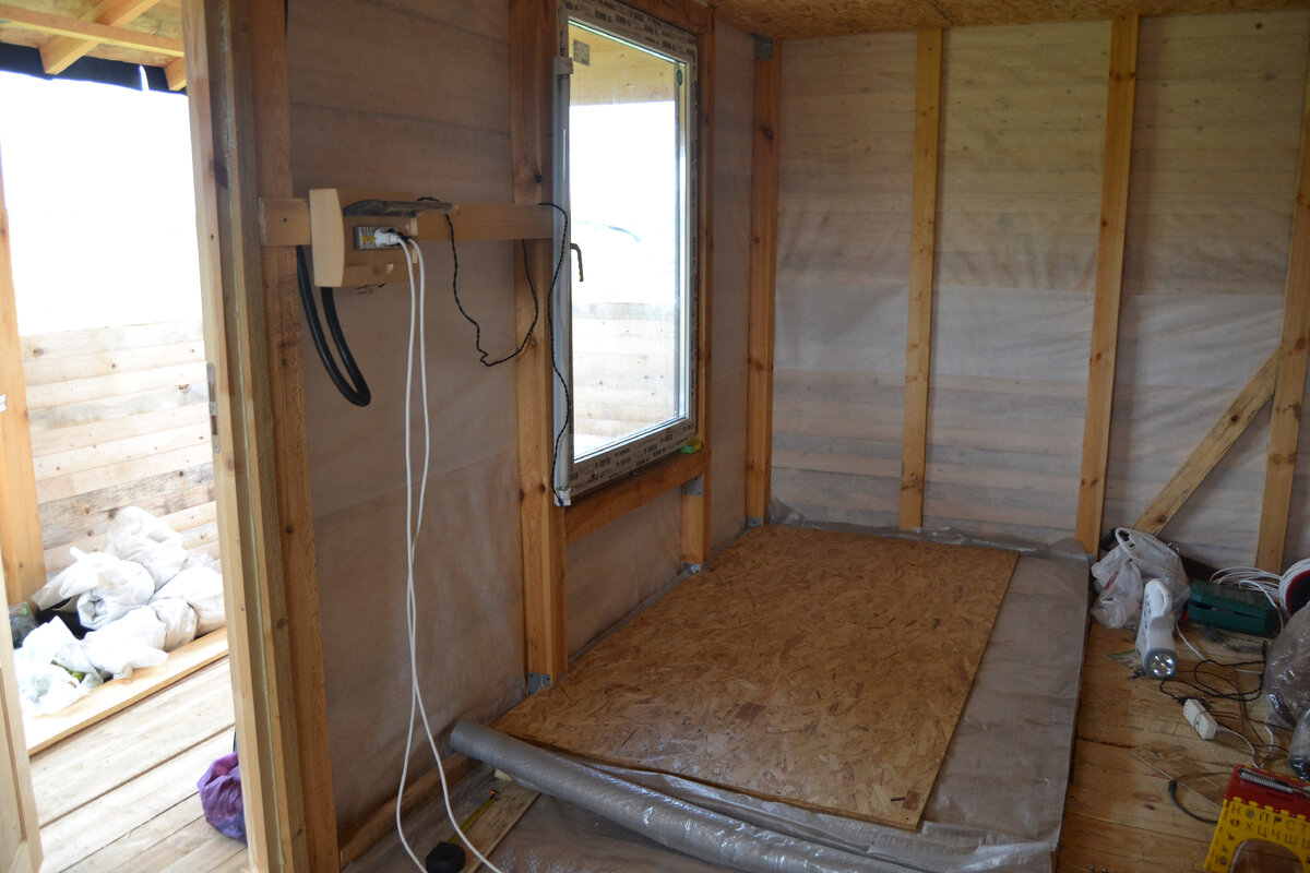 Здравствуйте друзья и подписчики! Я продолжаю публикацию строительства домика в деревне. И так, после того как произведена обивка евровагонкой дома и веранды можно приступать к внутреннему утеплению пола и стен. На пол я укладывал стекловату толщиной 5см в два слоя таким образом чтобы не было сплошных стыковочных проушин, то есть слой на слой, но в разнобой. Естественно предварительно положив изоляционный материал и снизу и сверху, а затем накрывал ОСБ листами стык в стык. Стены также утеплителем, только на углеродной основе типа "технониколь". затем степлером фиксировал пароизоляционный материал и произвел обивку евровагонкой также 2см. Потолок из ОСБ, в результате вот что получилось. Теперь можно заняться внутренними перегородками, думаю это уже не сложно и каждый сам определяет расстояния и количество комнат, арок и т. д. Сверху на чердаке потолок также утеплен "технониколь" с прокладкой материала пароизоляционного. В таком утепленном домике очень хорошо держится тепло. Если ста