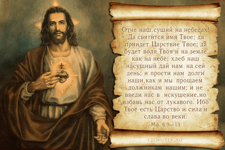 Отец наш, Который на Небесах! Да святится имя Твое. Да придет Царство Твое; да будет воля Твоя и на земле, как на Небе. Хлеб наш насущный дай нам сегодня. И прости нам долги наши, как и мы прощаем должникам нашим. И не введи нас в искушение. Но избавь нас от лукавого.