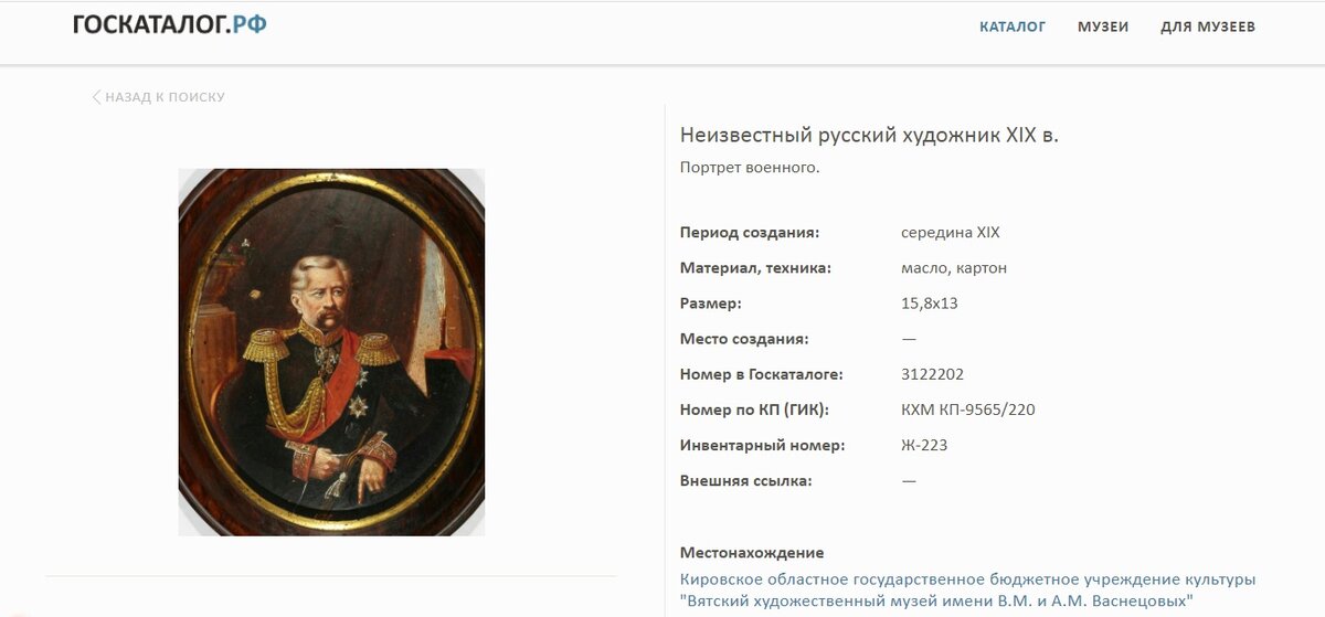 Очередной портрет из Госкаталога музейного фонда РФ. Хранится в Кировском областном государственном бюджетном учреждении культуры "Вятский художественный музей имени В.М. и А.М. Васнецовых". Автор неизвестен, персонаж обозначен как «военный», датировка – середина XIX в.