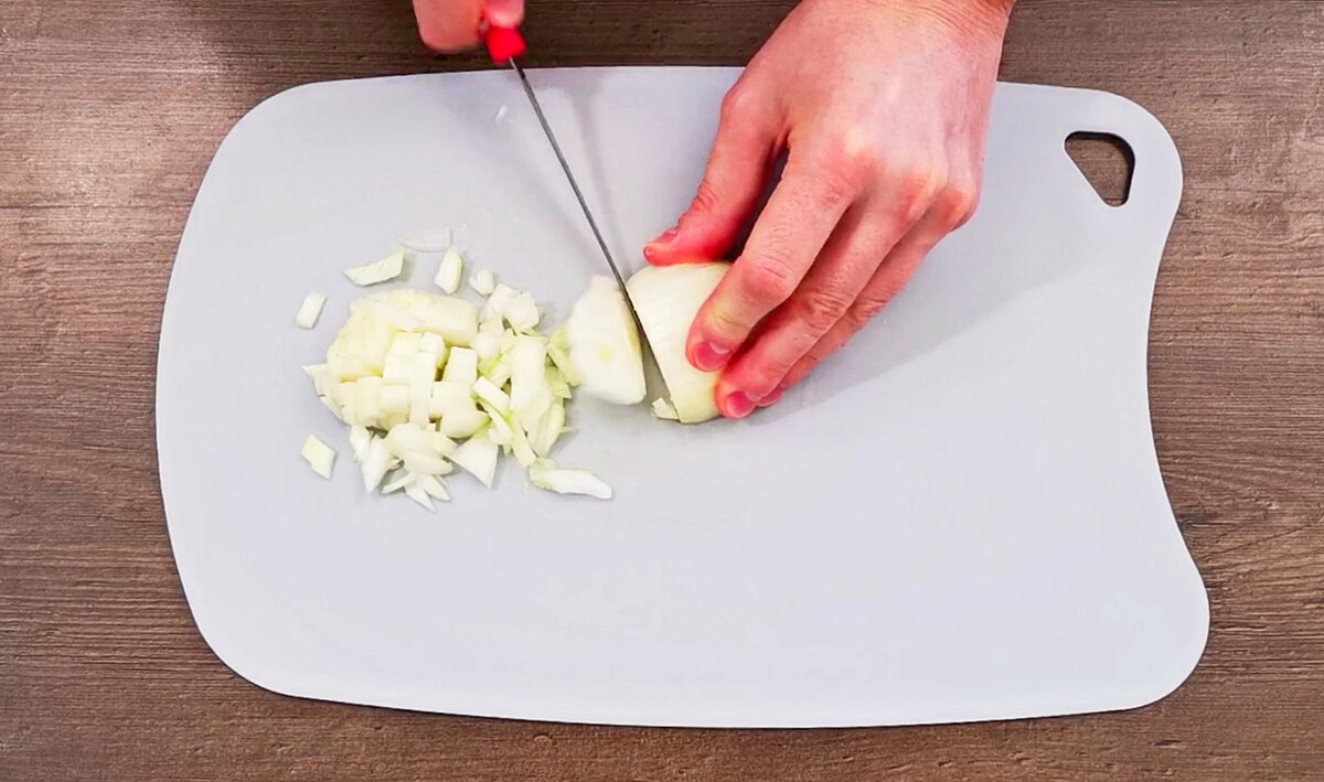 Хочу поделиться с вами рецептом турецкого блюда «Фиринда муцвери». Для приготовления понадобится одна луковица. лук нарезаю мелким кубиком и отправляю на сковородку обжариваться.