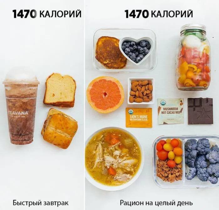 На самом деле, самое важное в вопросах похудения - это соблюдение суточной нормы калорий. Суточная норма высчитывается индивидуально и зависит от вашего основного метаболизма, уровня активности и индивидуальных особенностей Основной метаболизм - это то, количество энергии (ккал), которое необходимо для функционирования организма (даже если вы весь день лежите на диване) Вопрос не в запрете конкретных продуктов, а в вашем ВЫБОРЕ. То есть при одной и той же суточной норме калорий можно съесть пару любимых булочек или же иметь полноценный сбалансированный рацион (пример на картинке). Но это не говорит о необходимости ЗАПРЕТА Запрет на определённые продукты будет приводить к огромному стрессу для организма, а значит - к срывам и эмоциональному перееданию. Поэтому любимые блюда не просто можно, но и нужно вписывать в суточную норму калорий. Таким образом, вы всегда можете выбрать более подходящий вариант, и худеть без стресса🤞🏽 Присоединяйтесь к нашим онлайн-программам, чтобы практиковать