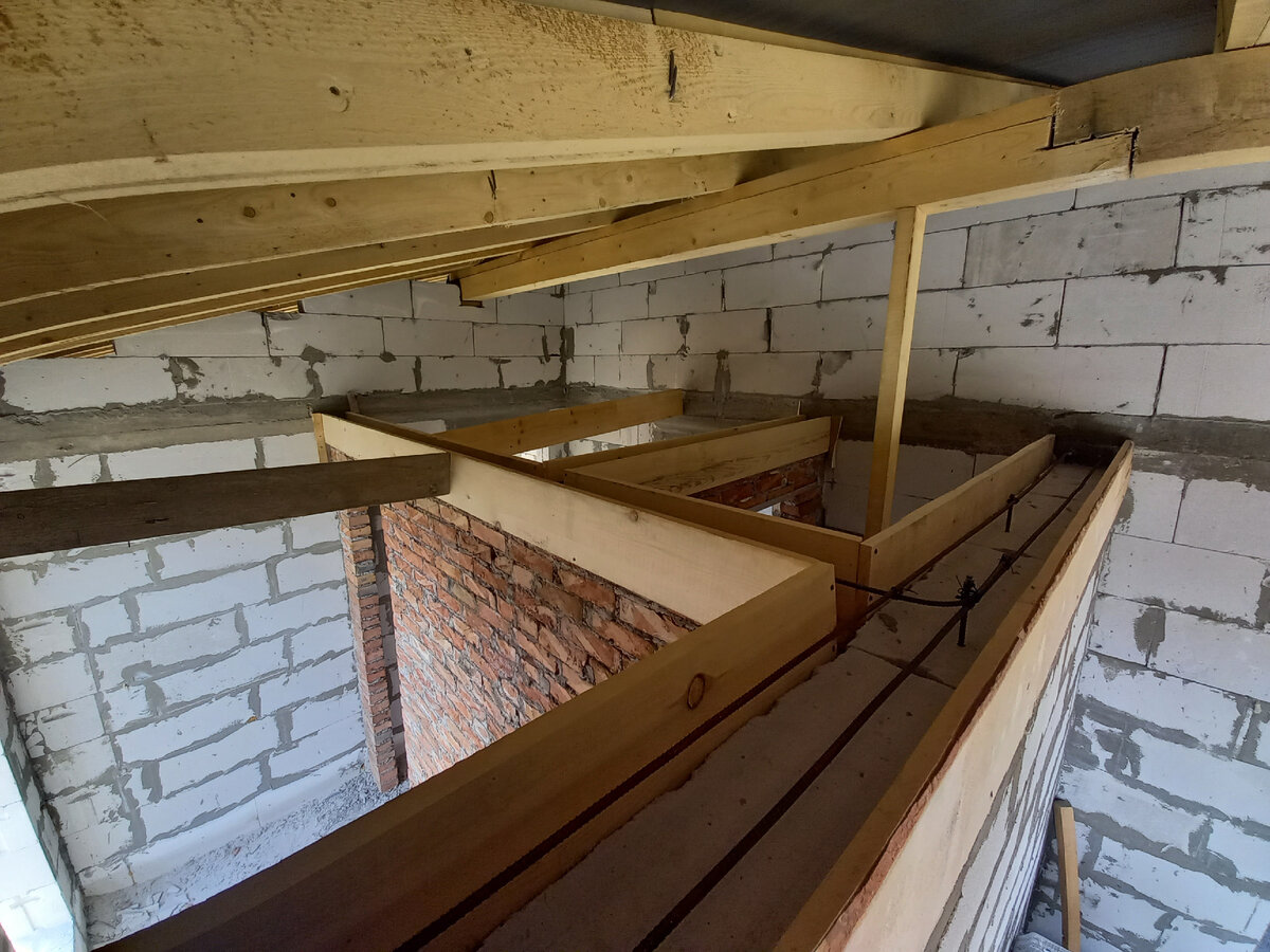 После успешной кладки перегородок, нужно было их воедино связать с внешним армопоясом. Так же этот армопояс будет служить опорой для лаг перекрытий потолка в помещении котельной и ванной. Для этого использовал доску дюймовку и чёрные длинные саморезы. Газобетон хорош тем, что можно без перфоратора закрутить необходимый временный крепёж. Всю опалубку армопояса отрезал по размерам и выставил с помощью лазерного осепостроителя, который купил на известной китайской площадке. Для усиления армопояса использовал по 2 прута металлической 10мм арматуры. Нагрузки там минимальные, но пусть всё же будет. В кирпич саморезы не вкручиваются, но они отлично вкручиваются в шов между ними! Местами опалубку просто подпирал досками. Для привязки армопояса перегородок к внешнему армопоясу, просверлил 10мм сверлом по бетону отверстия, забил в него отрезки 10мм арматуры и к ней уже привязал арматуру перегородок. Пришла пора готовить раствор и заливать в опалубку. Для этого брал 1 ведро цемента, 2 ведра щ
