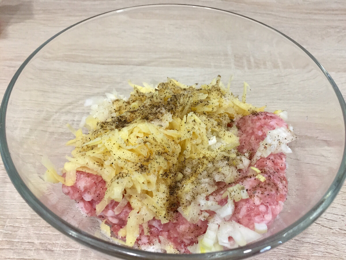 - Беру фарш (у меня всегда свой домашний: перемалываю свинину в мясорубке), добавляю мелко нарезанный репчатый лук, натертую картошку, соль и черный молотый перец.