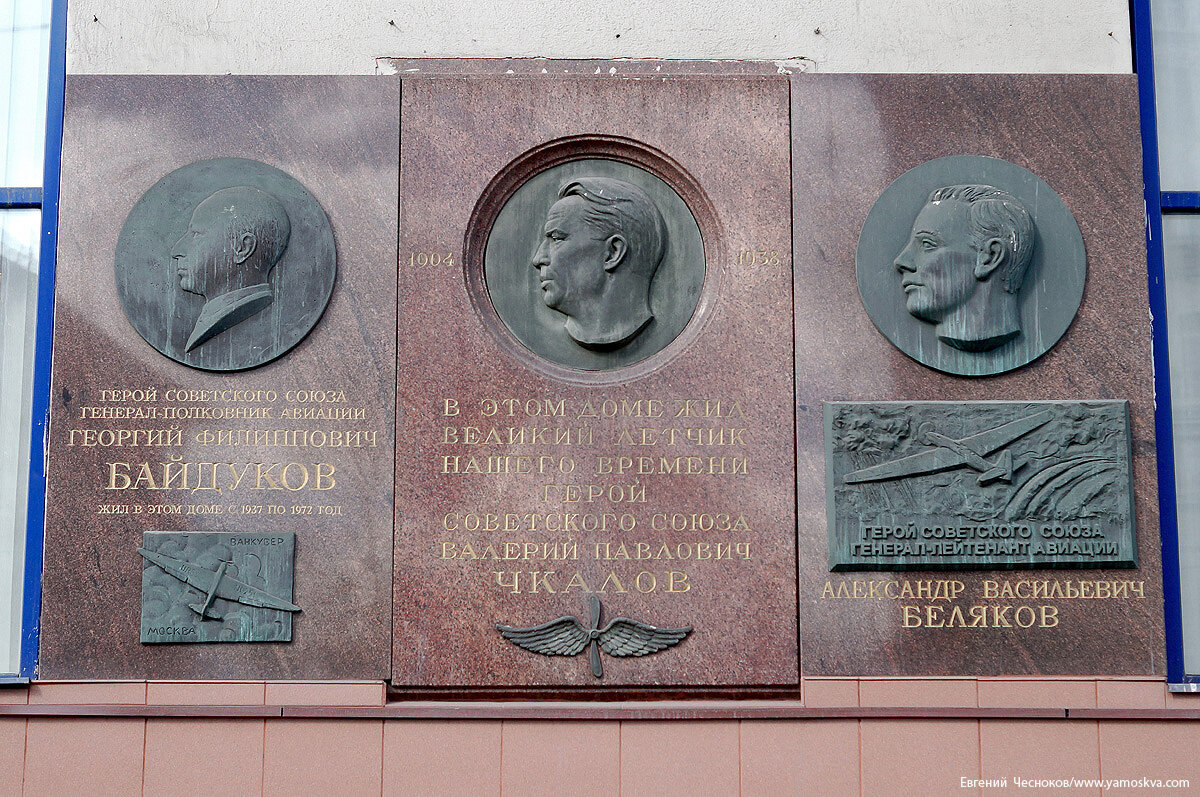 Земляной Вал, 3 (1953, архитектор И.Маркузе). Одновременно с постройкой этого дома был разбит сквер, называющийся Чкаловским. Здесь нет памятника или бюста лётчика, но его рекордный перелёт вспомнили при разработке дизайна современных скамеек.