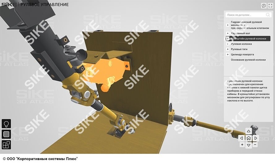 — В режиме «Демонстрация» ученик в свободной форме изучает конструкцию рулевого управления самосвала и его назначение: каждая деталь конструкции 3D модели снабжена названием и описанием. 3D модель повторяет устройство реального оборудования с детализацией до винтика!