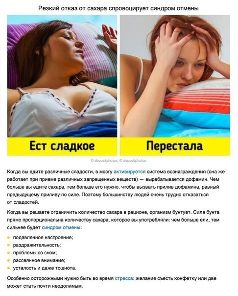 Замечали ли вы, что чем больше сахара мы употребляем, тем больше его хочется. Простой пример: год назад я любила класть в чай 1 ложку сахара, но сейчас мне этого мало! Я не чувствую, что чай достаточно сладкий! Мне нужно чуть больше сахара, больше чем 1 чайная ложка. Сахар, она так же, как кофеин вызывает привыкание. "Сладкая смерть" опасна для нашего организма. Посмотрите картинки и убедитесь, к чему может привести отказ от сахара. Следует заметить, если вы уже привыкли к сладкому, ни в коем случае не следует перестать употреблять его сразу. Нужно постепенно, умеренно сокращать дозы. Каждый раз всё меньше и меньше стараться употреблять его. В конце концов вы сможете избавиться от одной дурной привычки. Мои заметки: 1. Я ем сладкое, когда очень голодна, а обед или ужин еще не готов. В этом случае сладкое является перекусом. Вывод: вовремя готовить обед и ужин, не ждать пока проголодаюсь. 2. Кладу сахар в чай/кофе и чем его больше, тем лучше. Решение: минимализировать употреб