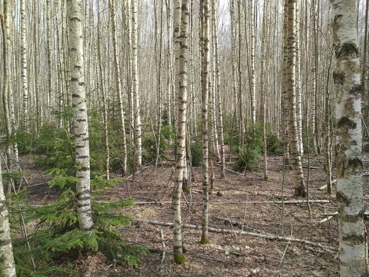 А какая красота бело-зелёная, пока природа ещё полностью на распустилась. Видно, как сосны/ёлки постепенно хотят выдавить березняк.