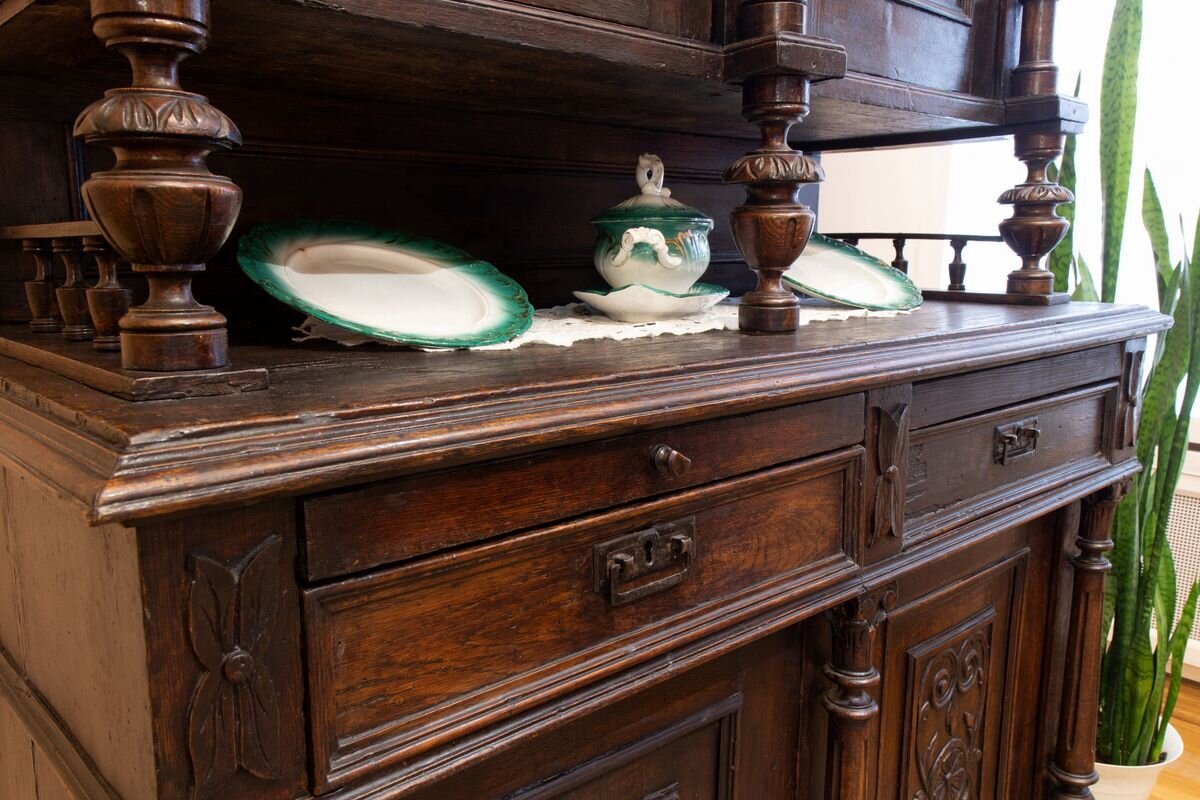 Деревянный резной буфет был изготовлен в Европе, а потом привезён в Гомель. Когда-то им пользовалась семья Шиловых с улицы Быховской. Платяной шкаф, тоже европейского производства, попал в музей от семьи Колобухиных с улицы Пролетарской. А германские настенные часы привезли из деревни Столбун Ветковского района.
