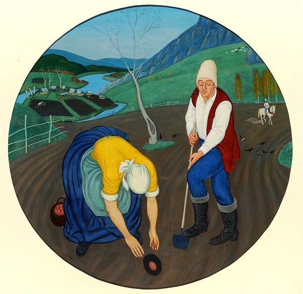 «Юрий Рысухин раскрывает смыслы, таящиеся в простом укладе деревенской жизни, которая неразрывно связана с природными процессами (сменой времен года). Цикличность времен года диктует род занятий персонажей в работах мастера. Образно-пластическая система художника наполнена аутентичностью исконного славянского образа жизни, уходящего в века. Мы узнаем своих предшественников в архетипах, воссозданных в работах автора. Силуэты фигур отличаются целостностью, монолитностью и внутренней гармонией. Позы и взгляд персонажей наполнены внутренним созерцанием» (куратор галереи SMART Горбунова Мария). Работа «Май. Посадка картофеля» является частью цикла картин «Времена года» и выполнена в старинной технике левкас (темперное изображение на фанере, покрытой специальным грунтом). Награды художника Рысухина Юрия: Работы художника находятся в музейных собраниях: Подробнее о картине и художнике можно ознакомиться на сайте галереи SMART. #картины художников #современное искусство #современные художники