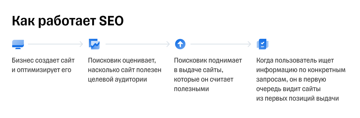 SEO — это действия, которые помогают поднять сайт в поисковой выдаче. Если правильно использовать SEO, поисковые системы будут показывать сайт на первых страницах по запросам пользователей.