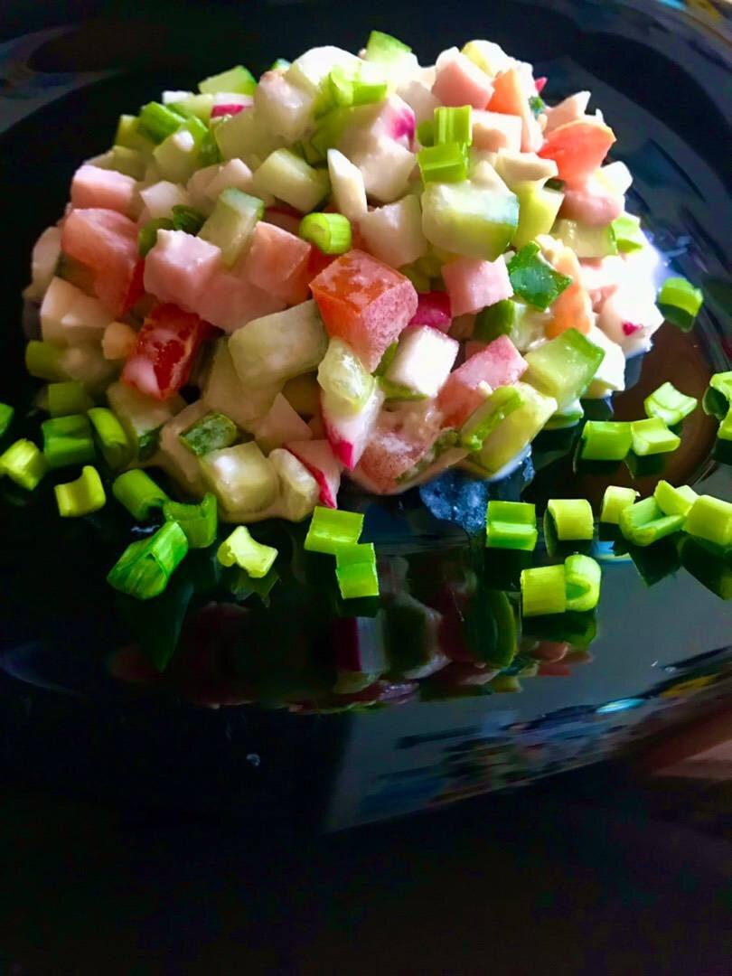 Ингредиенты: куриной ветчины, средних огурца, зелёного лука, редиса, варёных яиц, помидорки(грамм 250), сметаны 10%, Соль