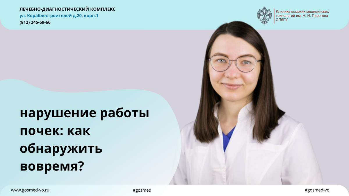 Болезни тех или иных органов не всегда дают знать о себе сразу, иногда мы чувствуем симптомы и дискомфорт только с течением времени, когда болезнь уже прогрессировала. У многих пациентов это вызывает тревожность и волнение: когда идти к врачам-специалистам, как описать свое беспокойство? Как проводить диагностику, если жалоб, в целом, нет и ничего не болит? Врач-нефролог клиники ВМТ им. Н.И. Пирогова Мария Лисова рассказала, как не пропустить заболевания почек и поддерживать здоровье этих органов. Если вас действительно ничего не беспокоит, то достаточно посещать своего доктора для планового минимального осмотра и сдачи анализов. Чаще всего, чтобы выявить какие-либо нарушения в работе почек, достаточно обследования на обычной диспансеризации. Период между плановыми обследованиями зависит от вашего возраста. Но хотя бы раз в три года врача-специалиста посещать обязательно! Врач определит список индивидуальных клинических исследования, которые расскажут о вашем здоровье. На этот список в