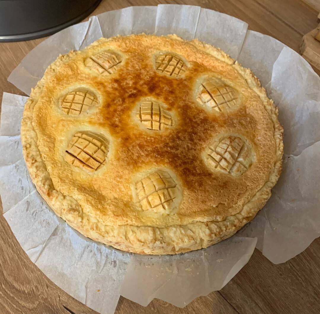 Выпекать 30-35 минут при 170-180 градусов или пока заливка не загустеет (когда шевелишь форму заливка не должна «дрожать»). Пока пирог горячий заливка жидковата, по мере охлаждения пирога заливка густеет. Поэтому лучше дать остыть пирогу полностью.