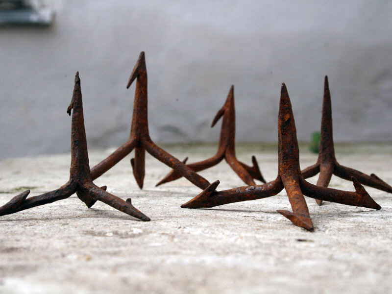 Некоторые поисковики наверняка находили странные железные изделия, представляющие собой комбинацию из четырех шипов. При любом положении на земле один из шипов всегда торчит острием вверх. Такие изделия были известны еще в 3 в. до н.э. и, не очень изменившись, дошли до наших дней и имеют очень много названий: воронья лапа, кальтроп, шострап у римлян трибола, у японцев макибиси, а в России они почему то получили название "чеснок" но так же встречаются названия рогульки железные, помётные или подмётные каракули. Чеснок простое, но эффективное оружие против лошадей, которое широко применялось в войнах, начиная от времени Александра Македонского и заканчивая Второй Мировой войной. Лошадь, наступившая на чеснок, как правило, падает и нередко калечит своего наездника. До наших дней дошли тысячи фактов использования чеснока в различных битвах многих стран. Так, например, греческий писатель Полиэн, сообщает, что в битве при Гавгамелах в 331 г. до н.э. персы усыпали местность железными шипами,