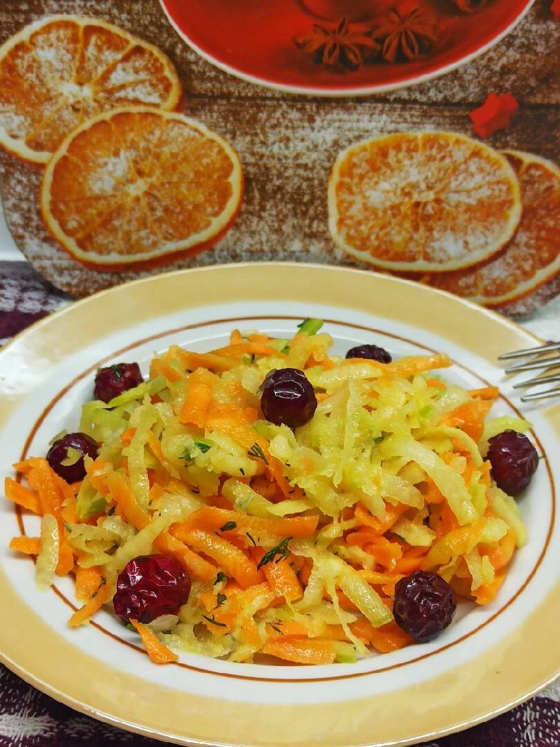Поэтому заправка уже должна быть готова. Не мешкая - заправляйте, сок лимона предотвратит потемнение яблока и салат останется красивым. Хорошенько всё перемешайте, а затем добавьте по вкусу соль, перец, щепотку сахара. Ещё раз перемешайте. Для кислинки можно добавить зерна граната или ягоды клюквы/брусники. Украсьте зеленью.