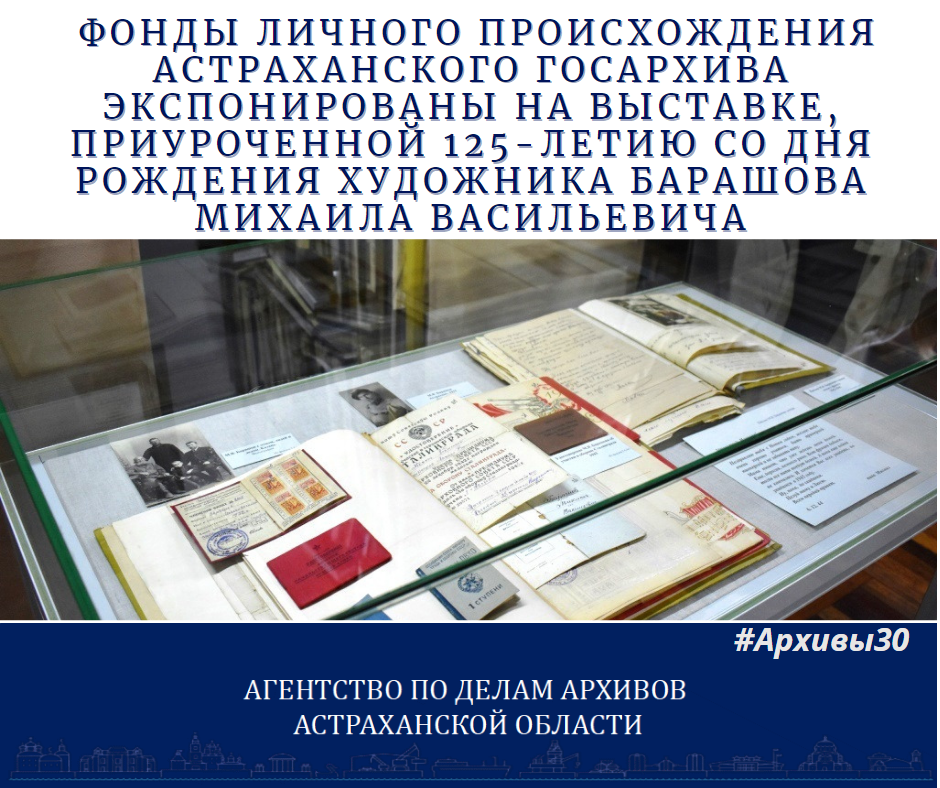 Совместная выставка «М.В. Барашов: жизнь и творчество» Астраханской государственной картинной галереи имени П.М. Догадина и Государственного архива Астраханской области стартовала 26 апреля 2022 года. В стенах галереи представлены произведения графики М.В. Барашова и документы из личного фонда художника. Впервые документы художника М.В. Барашова поступили на хранение в Государственный архив Астраханской области в 1964 году. Их передала его жена Кулагина Ольга Петровна, а уже после ее смерти еще 708 документов сдали в архив ее родственники. Документы из личного фонда раскрывают творческую и семейную жизнь художника. Документальные материалы фонда состоят из творческих материалов, рисунков, каталогов выставок, плакатов к выставкам и спектаклей, оформленных художником, а также переписка и личные документы (свидетельства о рождении, браке, смерти и т.д.). Большое количество документов составляют изобразительные материалы - фотографии Барашова М.В., его родственников и знакомых, а также арт