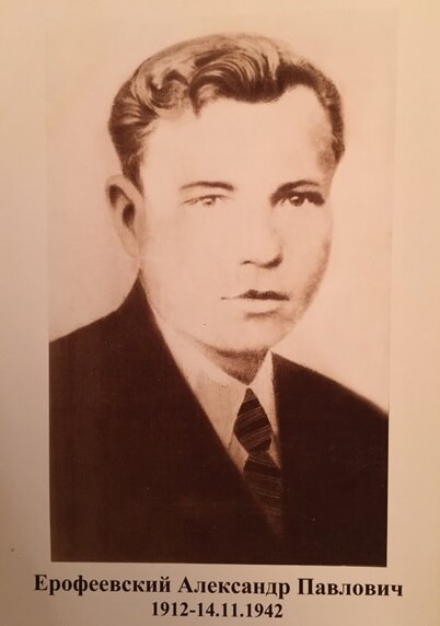 «Великая Отечественная война, которую вёл советский народ против немецко-фашистских захватчиков, победоносно завершилась, Германия полностью разгромлена!». Жаль, что этих слов не услышал мой дед. В конце 1942 года Мария Васильевна получила «похоронку», что её муж Ерофеевский Александр Павлович в бою за Социалистическую Родину, верный воинской присяге, проявив геройство и мужество был убит 14.11.1942 года и похоронен в районе станций Дубцы – Гряды Чудовского района, Ленинградской области. Не могу даже представить, какую боль принесла эта похоронка прапрабабушке. Осознание того, что её 30-тилетний муж погиб на войне, что он больше не обнимет ни её, ни их детей, он больше не придёт с работы, не сядет за обеденный стол, не произнесёт свою знаменитую речь перед кушаньем и не приласкает своё семейство добрым словом, просто не может до конца уложиться в голове. Но тем не менее Сержант Ерофеевский Александр Павлович увековечен внесением в списки похороненных в братской могиле у деревни Суровка Чудовского района Новгородской области.