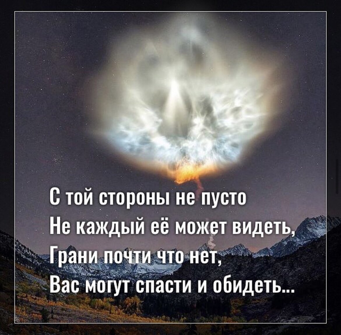 С той стороны не пусто, Не каждый её может видеть, Грани почти что нет, Вас могут спасти и обидеть. Смешно иногда от поступков, Которые спрятать хотите, Мы же насквозь вас видим, И слышим, когда молчите. Мы знаем, кто изнутри тёмный, При случае бьёт сразу в спину, А кто внутри с ярким солнцем Молча ныряет в пучину, Чтобы спасти кого-то, Взамен ничего не прося, Он по-другому не может, Сущность его в этом вся. Нет смысла врать нам в поклонах, Тем, кто Душою чёрный, Сначала путь поменяйте, Поступок свершите добрый, Много ещё работы Предстоит на пути к свету, Меняйтесь пока не поздно, Призовут наверху к ответу! А светлым не стоит бояться, Вы мир добротой наполняете Мы всегда с вами рядом И вы это точно знаете. 🙌❤️
