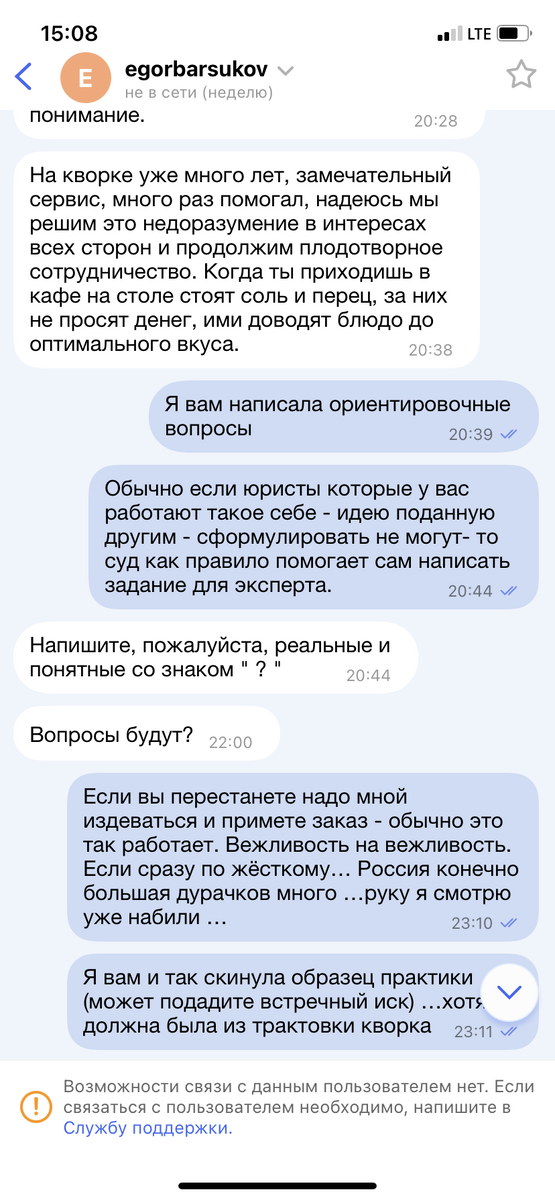 Итак, я давно писала что сей сервис славится неадекватными "гражданскими" и даже частнопрактикующими псевдокрутыми юристами, которые просто ищут себе дешевых (за еду) внештатных помогаек для набора текстов. Задание было - изучить материалы и обозначить позицию по делу - сумма 800₽ что я считаю равнозначной 2-м листам шрифта 12 и ссылку на примерный образец документа, а также ссылку на подходящую практику. Смысл консультации ИМХО -задать только направление для мысли, что и есть юридическая позиция. Потом этот Е.Б. - выждал максимальный срок приема- 3 суток стал с меня требовать конкретные формулировки по экспертизе и продлял срок приемки заказа (еще на 3 дня!) - я тоже общими словами обозначила....видимо шеф настолько тупой что не может переработать информацию -а хочет просто скопировать-вставить. Потом я просто молчу чтобы прошли судки до автопринятия - персонаж попытался вовсе отменить Заказ. Я его опередила и обратилась в арбитраж - если бы не это опережение на долю секунд = то