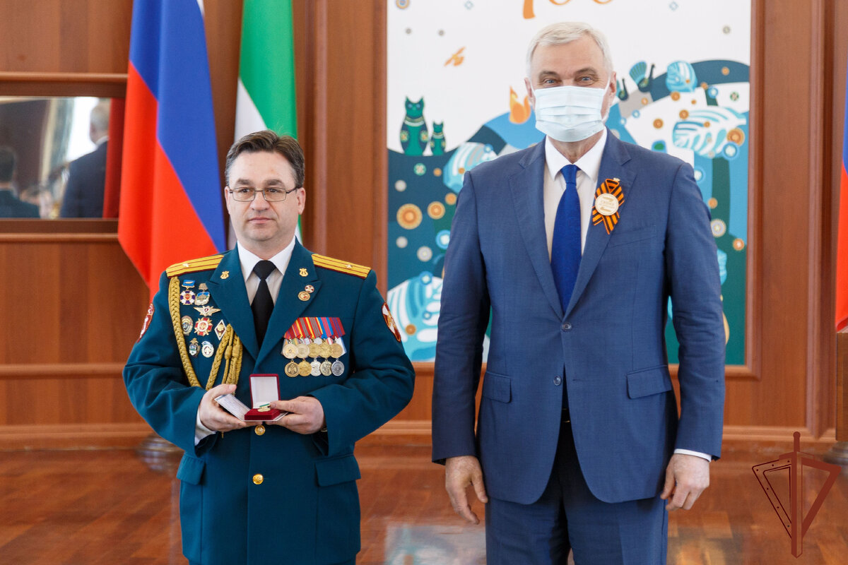Владимир Уйба вручил офицеру награду и поблагодарил его за многолетний добросовестный труд, высокий профессионализм, а также за большой вклад в нравственное и патриотическое воспитание подрастающего поколения.