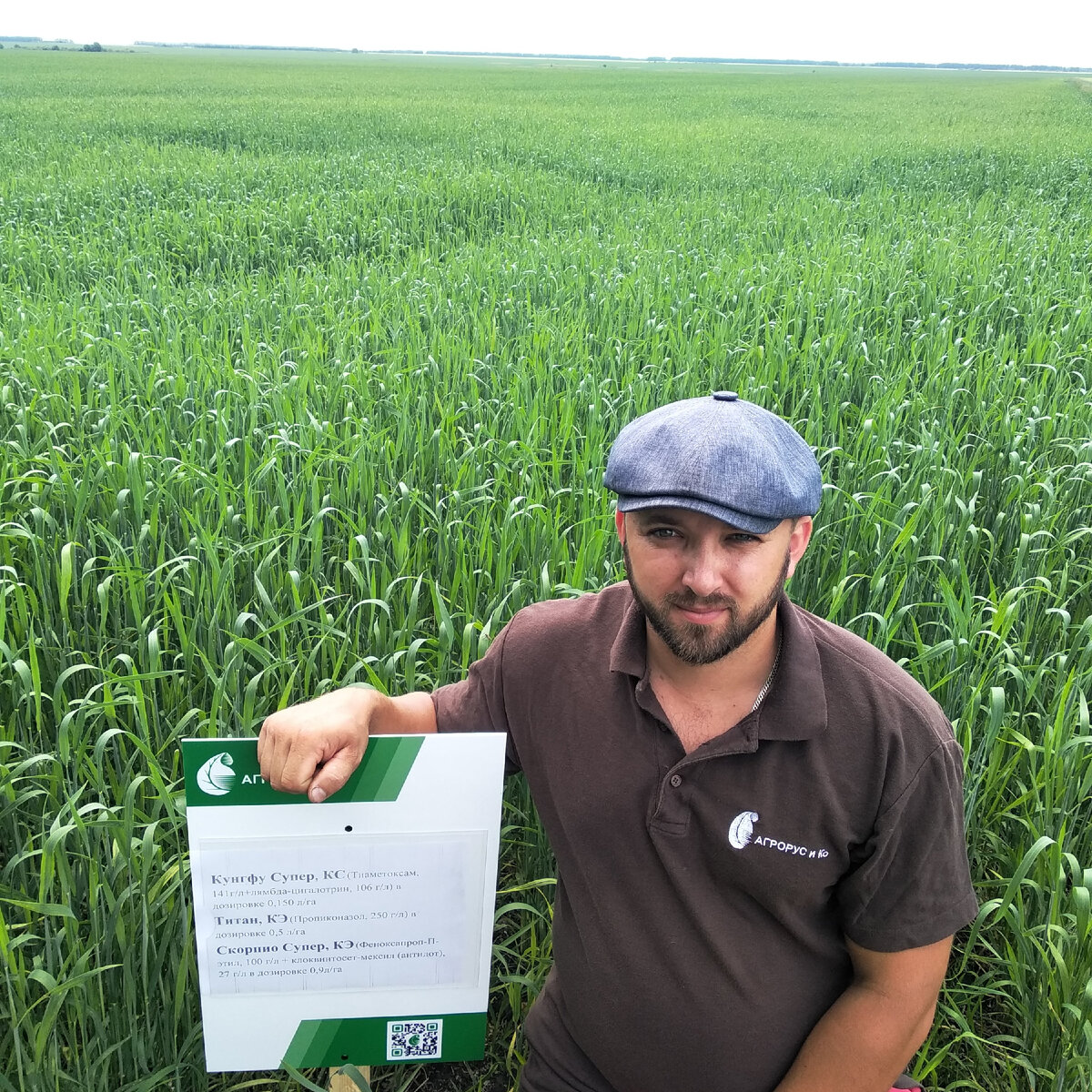 В Пензенской области в сезоне 2021 года проводили производственный опыт по комплексной защите яровой пшеницы. В опыте использовали препараты: - гербицид для контроля однолетних злаковых сорняков Скорпио Супер, КЭ (феноксапроп-П-этил, 100 г/л + клоквинтосет–мексил (антидот), 27 г/л); - фунгицид Титан, КЭ (пропиконазол, 250 г/л) для защиты от грибных заболеваний; - инсектицид Кунгфу Супер, КС (тиаметоксам, 141 г/л + лямбда-цигалотрин, 106 г/л) для уничтожения вредителей. Опрыскивание было решено проводить в фазу конец кущения культуры, когда взошла большая часть однолетних злаковых сорняков, овсюг был в стадии начало кущения, просо куриное 2 листа. На момент обработки у яровой пшеницы были первые признаки болезни гельминтоспориозная пятнистость. Из вредителей на момент обработки были хлебные блошки. Обработку проводили 27.05.2021 баковой смесью Скорпио Супер, КЭ (0,9 л/га) + Титан, КЭ (0,5 л/га) + Кунгфу Супер, КС (0,15 л/га) + гербицид для контроля двудольных сорняков (2,4Д + флорасула