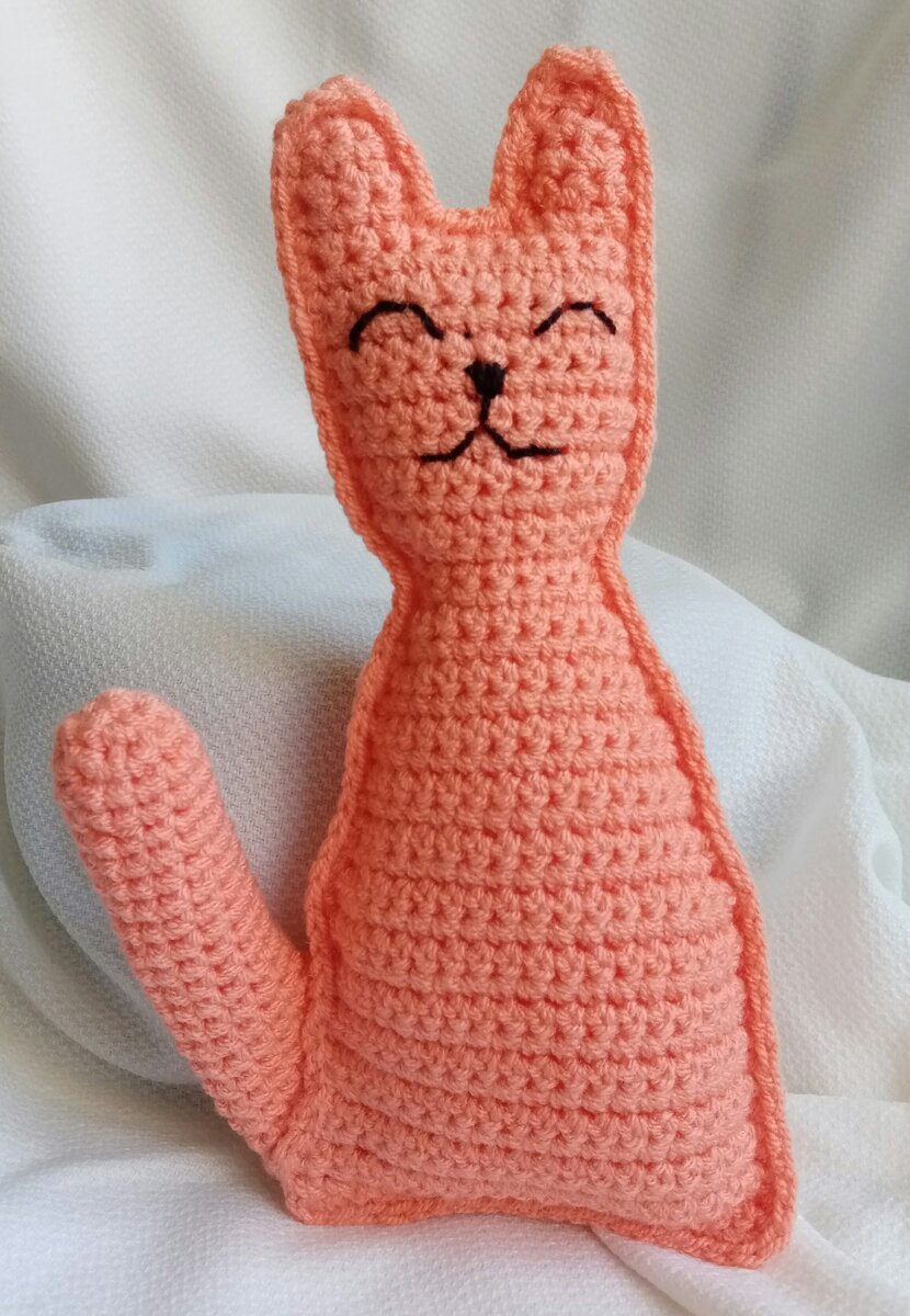 Вяжем кота, которого сможет связать даже начинающая рукодельница. Игрушка в высоту 20 см. Пряжа акрил, крючок №4, наполнитель, черная нить, игла. Кот вяжется из двух половинок, которые затем соединяются между собой столбиками без накида. Половинки вяжем туда обратно с петлёй подъёма в начале каждого ряда. Прибавки и убавки делаем в начале и в конце ряда. Хвост вяжется отдельно, потом ввязывается в тело, можно пришить, в высоту по всей длине. Итак, начнём. Одно ухо у нас составляет единое целое с телом, и начинаем мы с него. 2 воздушные петли. 1й - 2й ряды: 2 сбн. 3й ряд: прибавки, (4). 4й - 5й ряды: 4 сбн. Начинаем вязать тело с головой. От последнего столбика набираем 8 воздушных петель и вяжем 10 рядов по 12 сбн. 11й ряд: убавки (10). 12й ряд: убавки (8). 13й ряд: убавка с одной стороны (7). 14й ряд: прибавка (9). 15й ряд: прибавка (11). 16й ряд: 11сбн. 17й ряд: прибавка (13). 18й ряд: прибавка (15). 19й - 22й ряды: 15 сбн. 23й ряд: прибавка (17). 24й ряд: прибавка (19). 25й - 40й ря