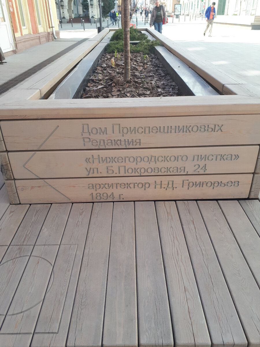 На улице стоят скамейки, на которых помещена краткая информация о доме, рядом с которым они стоят.