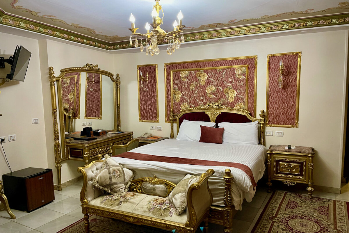 В Асуане у нас была одна ночёвка. Причем именно ночёвка – приезжали мы в отель уже поздно, а утром в 5 часов должны были выдвинуться в сторону храма Абу Симбел. Поэтому переплачивать за супер-отель как в фильме «Смерть на Ниле» смысла не было, нашли оптимальный по цене-качество, в центре. Усталые – после ночёвки в адском поезде мы сразу же отправились на остров Филе, потом в каменоломни – отдаём паспорта на ресепшен и слышим в ответ, что брони на нас нет. Что? Оказалось, что у жены дрогнула при бронировании рука, и она выбрала даты не в декабре, а в январе, то есть нас ждали в этом отеле через месяц. Мы уже были готовы открывать букинг и искать другие варианты, но сотрудники отеля позвонили куда-то, посоветовались и объявили нам, что готовы без доплаты предоставить нам номер, который есть в наличии – какой-то суперлюкс. Мы выдохнули, заказали на утро ланч-боксы на завтрак и пошли в свой суперлюкс. Заходим. Мама дорогая! Позолота, лепнина, на вид прямо дорогой отель времён британской ко