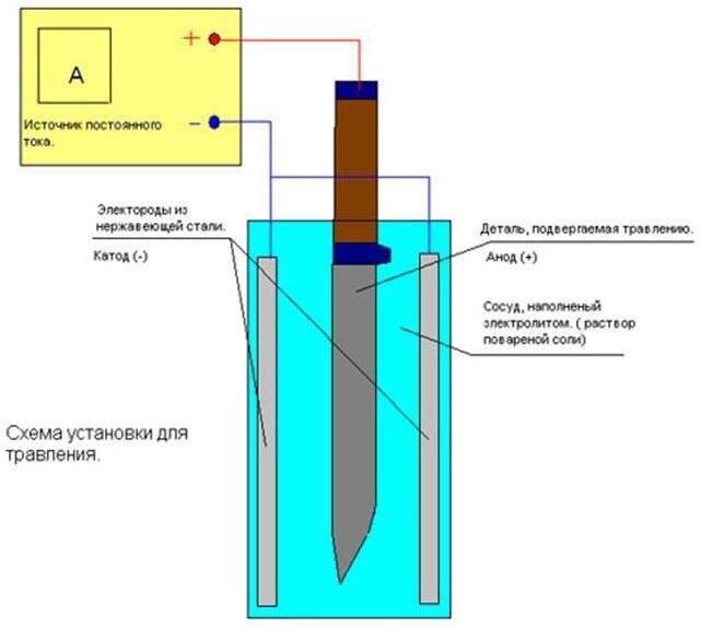 Удаление части поверхностного слоя металлического изделия с помощью химической реакции называют травлением. Перед проведением травления на те участки поверхности металла, которые не должны быть вытравлены, наносится защитное покрытие, устойчивое к травящему веществу (протраве). Далее деталь подвергают воздействию кислой среды или погружают в емкость с электролитической жидкостью. Чем дольше деталь подвергается обработке, тем больший слой металла разъедается агрессивной средой. Способы травления металла 1.Химический (жидкий). Применяются кислые растворы. Не требует сложного оборудования и дорогостоящих материалов. 2.Электрохимический. Применяется раствор электролита и пропускаемый через него электрический ток. Для проведения процесса в домашних условиях потребуется: 1.Гальваническая ванна из непроводящего материала. 2.блок питания на 5 вольт постоянного тока. 3.металлический катод (из того же металла, что и заготовка.) 4.проволочные подвесы для заготовки и катода. Заготовка не должна ка