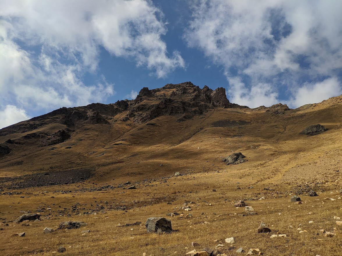 Итак. Часа два мы ехали от Сисиана до Ухтасара, часа два провели там в квесте за петроглифами. Да, наше продвижение по точкам существенно замедлилось. Отправляемся обратно к шоссе и цивилизации. Кстати, чего ещё не было: вид в сторону, обратную озеру. Тоже живописная гора. Когда стали отъезжать, увидели лису – пробежала впереди у дороги. Быстро, я и рассмотреть не успела. Хм, были ли лисы на рисунках? И ещё у меня записаны ящерицы. Впрочем, я и так помню: ящерицы попадались довольно часто. Даже в городе Такие, маскировочной окраски, под серую траву. Дальше в посте будут виды живописные, либо выразительные – о том, как мы ехали вниз под углом 60 градусов. Ну, может, 45. Или 30. Или меньше? Но пока просто горы. Поднялись повыше – открылся головокружительный вид вниз. Аааа, нам же туда съезжать сейчас! Видно. Как дорога вьётся впереди. А также крупным планом – прямо то, что у нас сейчас будет под колёсами. То ли освещение изменилось, то ли телефон под другим углом повернула. Короче, те са