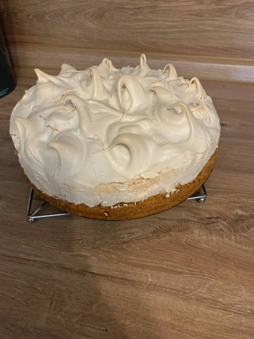 Ставим пирог в духовку разогретую до 140 С. Сушим меренгу 40-60 минут. Меренга должна подрумяниться до кремового цвета, не надавливая потрогать пальцем, не должна липнуть, сверху хрупкая корочка, внутри остаётся мягким.