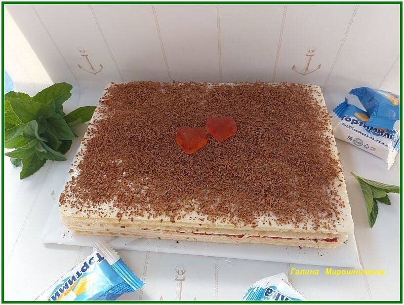 Смазанный корж присыпать тертым шоколадом или шоколадной стружкой.
