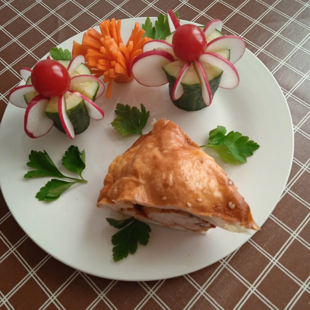 Очень вкусный пирог, здесь получается два в одном, сама курочка и вкуснейшее тесто пропитанное специями и куриным соком. Да и к праздничному столу он всегда подойдёт. #академия Ингредиенты: куриных голеней, слоёного бездрожжевого теста, соли, томатной пасты, сыра, яйцо, паприки, смеси перцев, сушёного чеснока, сушёного базилика, по желанию кунжут для украшения, растительное масло для жарки Способ приготовления: Голени посыпать паприкой, сушёным чесноком, смесью перцев, солью, добавить томатную пасту, хорошо перемешать и оставить мариноваться на 30 минут. Затем в сковороду налить растительное масло и обжарить голени до полуготовности, выложить на тарелку. Тесто раскатать, вырезать, с помощью тарелки круг диаметром 26 см., можно сделать это сразу на пергаменте. Выложить голени по кругу, чтоб кончики выступали за край теста. У меня голени оказались без нижних кончиков, поэтому я их просто выложила по кругу. Посыпать голени сухим базиликом (можно любыми, любимыми вашими травками) и натёрты