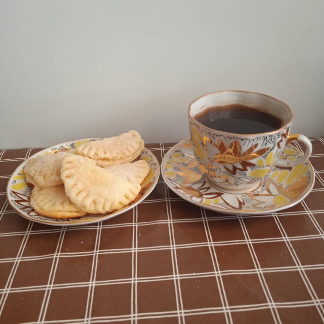 Каждый кружочек посыпать сахаром, свернуть пополам, края скрепить вилкой и сверху посыпать сахаром.
