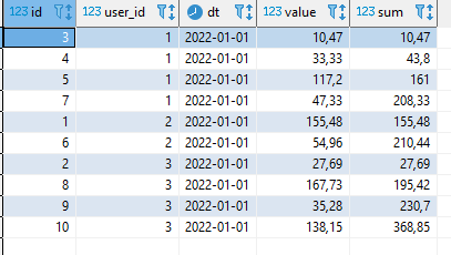 value - потраченная сумма Необходимо сформировать таблицу со столбцом в который будем выводить возрастание трат каждого потребителя в определенный день. Решение Сгенерируем таблицу из 10 строк, а затем сделаем вычисление. Рассмотрим два варианта решения: Через оконную функцию Через join