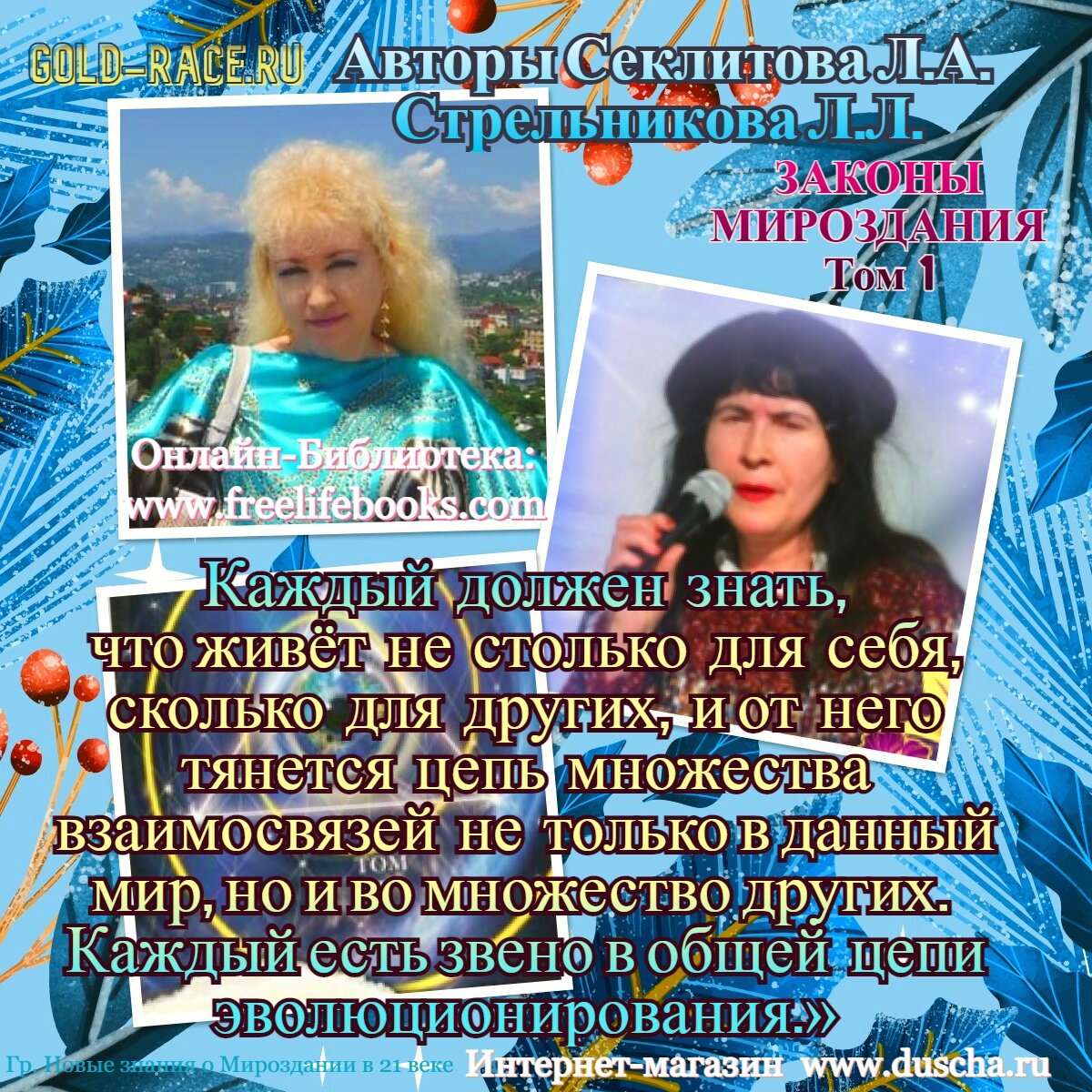 Каждый должен знать, что живёт не столько для себя, сколько для других, и от него тянется цепь множества взаимосвязей не только в данный мир, но и во множество других. Каждый есть звено в общей цепи эволюционирования.»