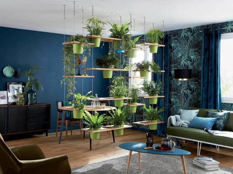 В нашем обзоре недорогие, оригинальные и практичные варианты. Шкаф или стеллаж Почему шкаф или стеллаж нужно обязательно ставить к стенке? Они отлично впишутся в интерьер большой комнаты, если будут выполнять роль не только системы хранения, но и функции «стены». Особенно это хорошо получится, если вы выберете модель, которая будет доходить до потолка. В таком случае большой шкаф будет даже частично гасить звуки. Стена из растений Здесь просто зелёное море вариантов. Можно сделать «стену» из лиан, которые будут расти на несущих конструкциях, бечёвках или канатиках, и и играть роль живой ширмы. Хорошо будет смотреться и вертикальная подставка, на которой стоят кашпо с домашними растениями. Ещё один вариант: висячие «сады», которые крепятся на потолке. Шторы Шторы подойдут не для каждого интерьера, но если у вас прованс, скандинавский или эко-стиль, то они отлично впишутся. Шторами чаще всего зонируют спальные места. Однако если брать не традиционную портьеру, а жалюзи или рулонные шторы